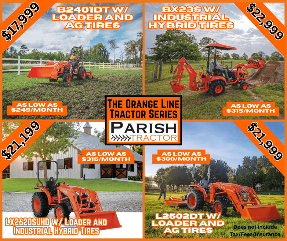 These Orange Line tractor packages include the equipment you need to tackle jobs fast, with affordable monthly payments available. Stop by or call today to check availability and lock in your deal!